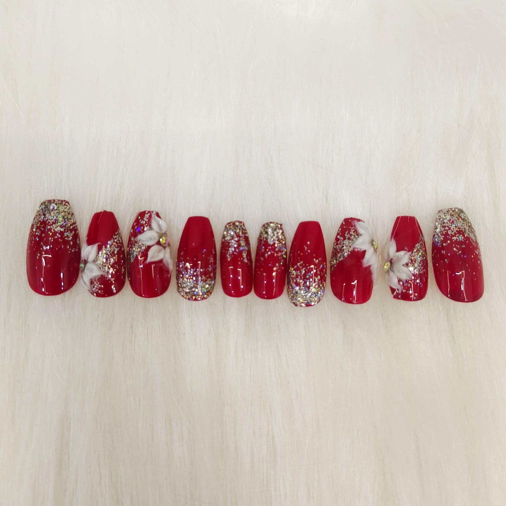 Maroon 3D Floral Glitter Bridal Nails