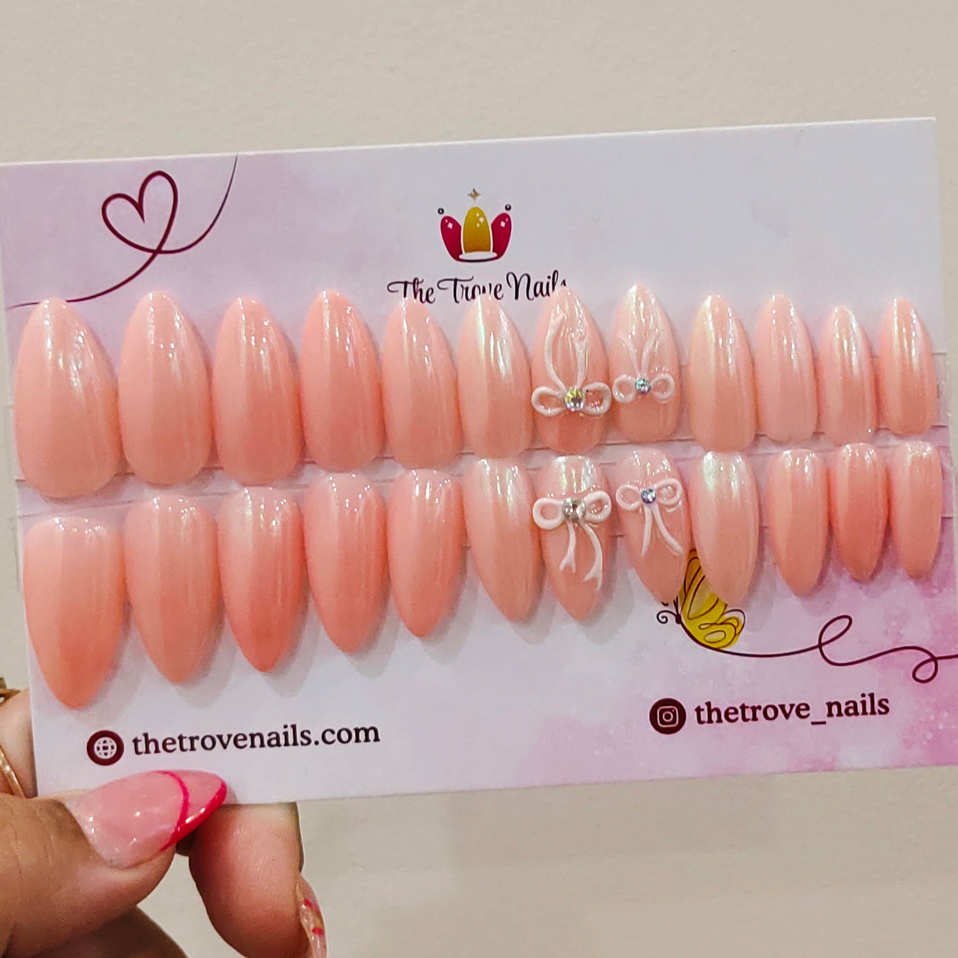 Experience the opulent indulgence of Peach Chrome Bowtie Nails. Effortlessly exude elegance with our exquisite premium nails, perfect for any occasion. Their unparalleled sophistication and long-lasting durability make them a must-have for 5-6 uses. Elevate your style with our refined Glue-On Nails, adorned with a touch of refined artistry that will captivate all onlookers.