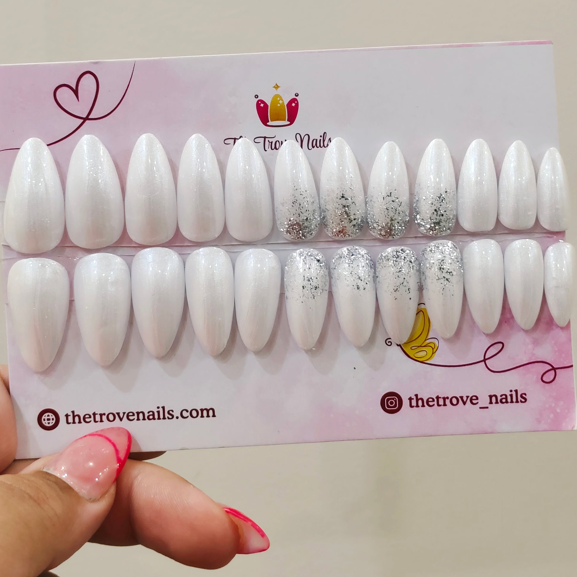 Unmatched lavishness awaits with Snowhite Glitter Nails. Effortlessly exude grace with these impeccable nails, perfect for any occasion. Their unsurpassed elegance and exceptional resilience make them a must-have for various events. Enhance your look with our exquisite Glue-On Nails, featuring a refined artistic design that will captivate all observers.